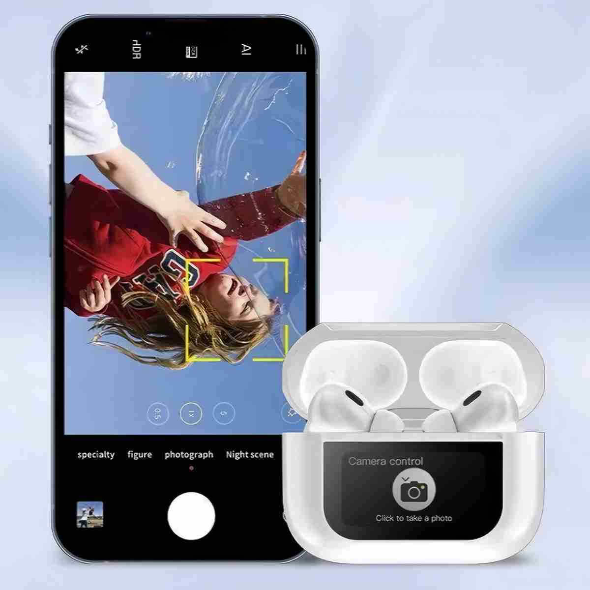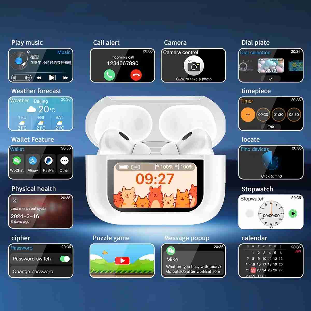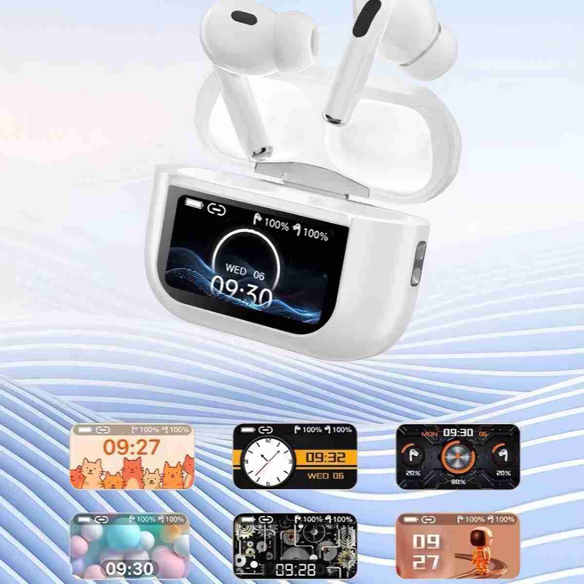 - Pantalla Táctil en el Estuche: Accede a una variedad de funciones directamente desde la pantalla táctil del estuche de los auriculares, facilitando el control y la personalización de tu experiencia auditiva.