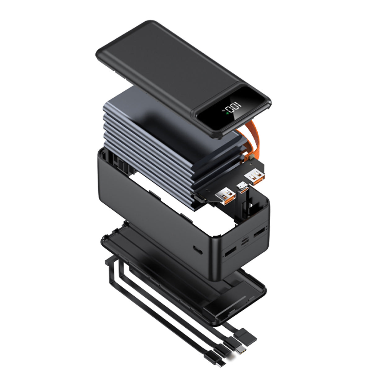 PowerBank 60.000 mAh, Batería externa Almalux® 22.5W, 2 USB-A, 4 Cables integrados + 2 adicionales Tipo-C y Micro USB, Pantalla LED y Linterna